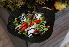 290 г • Микс-салат, говяжья вырезка, свежий огурец, томат, сладкий перец, медово-горчичная заправка